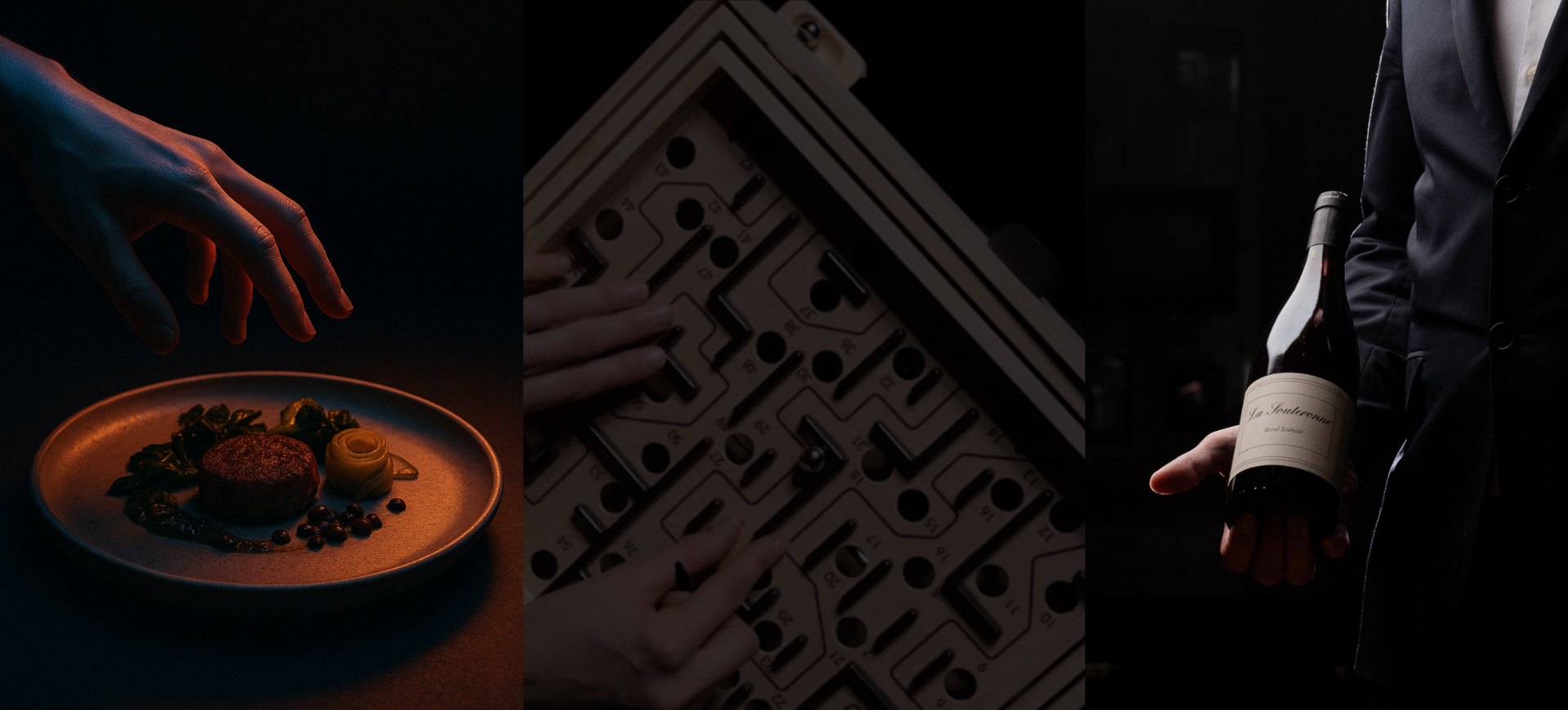 Le repas est servi à l’aveugle. Les menus sont élaborés pour provoquer curiosité, textures inattendues, arômes à déchiffrer et souvenirs gustatifs forts.